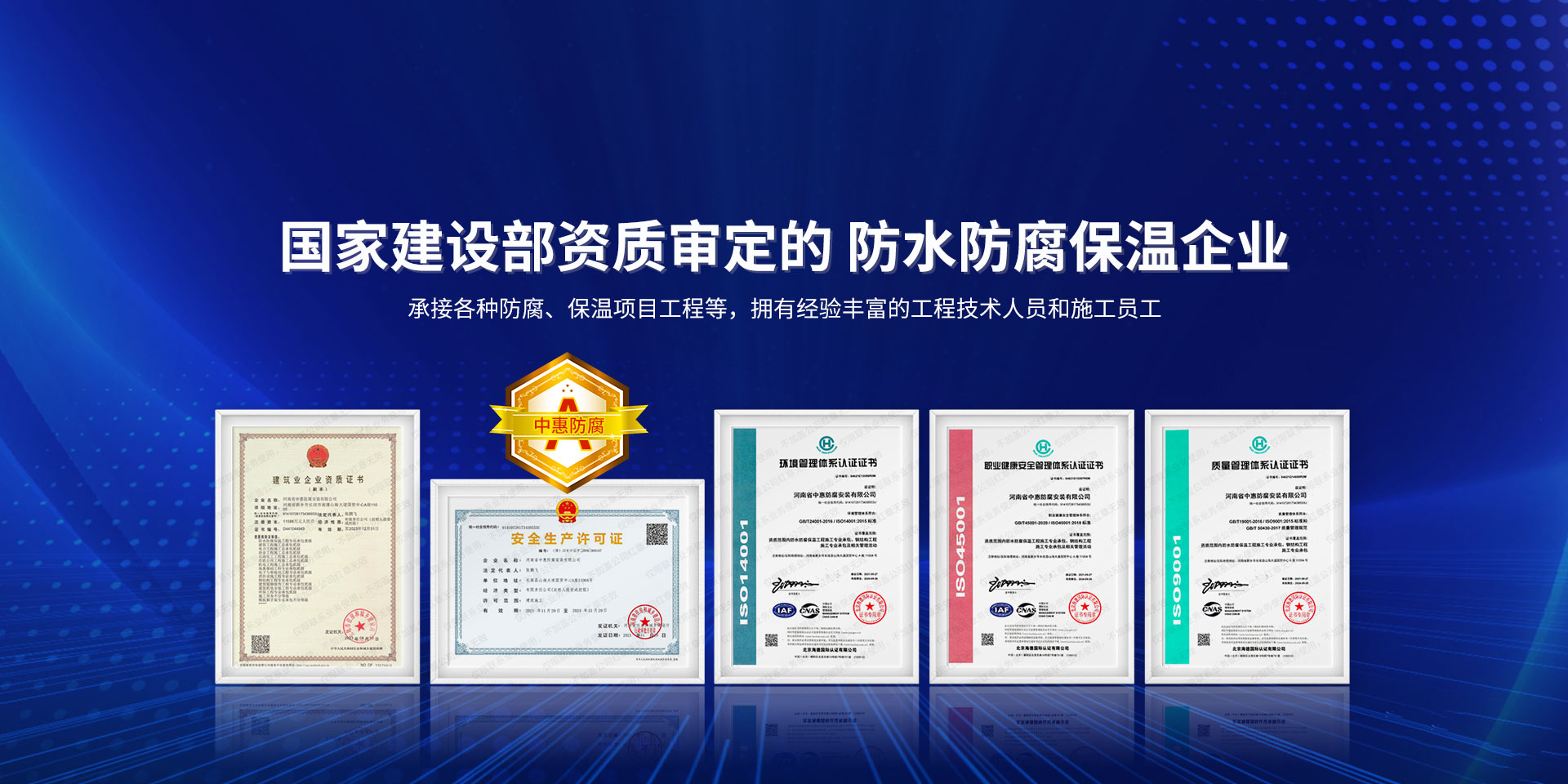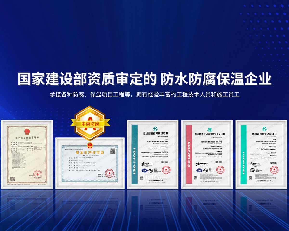 公司經營范圍:防水防腐保溫工程;消防設施工程;建筑裝修裝飾工程;建筑機電安裝工程;電力工程;建筑工程;石油化工工程;工業清洗工程;油罐清洗工程;鋼結構工程;環保工程;模板腳手架工程;電纜防火封堵、防污閃噴涂、外墻外保溫工程;各類施工勞務作業;設備維修、船舶鉚焊、涂裝;電力工程材料、建材、防水材料、防火材料、防腐保溫材料銷售,并相繼通過了GB/T19001-2008idtISO9001:2008GB/T50430-2007質量管理體系認證證書。GB/T24001-2004idtISO14001:2004環境管理體系認證證書。GB/T28001-2011idtOHSAS18001:2007職業健康安全管理體系認證證書。公司是中國防腐蝕于防護協會、中國施工企業管理協會、電力協會和中國鋼結構防水協會會員單位。 公司的經營業務涵蓋了石油、化工、電力、冶金、煤炭、船舶、國防、燃氣、水利、環保、交通運輸、航空及國防軍工和輕紡市政等行業的防腐保溫絕熱設備。鋼結構安裝、防火、防水、金屬噴鍍、聚脲噴繪、陰極保護、防滲透堵漏、玻璃鋼及各種磚版材料襯里、橡膠襯里、煙氣硫和耐酸溶劑腐蝕等工程施工。公司連續十年榮獲“省市先進施工企業”“安全生產先進單位”“重合同,守信用企業”和“AA***資質企業”的稱號。2000年被命名為市級文明單位,2002年被國家工商行政管理局命名為“重合同,守信用的企業”、被中國工業防腐蝕技術協會命名為“防腐蝕企業,能源節約及環境保護領域有豐富的經驗和***的業績。工程一次交驗合格率100%。其中攀枝花鋼鐵公司煉鐵廠四號高爐及熱風爐防腐工程、上海寶鋼公司煤氣柜防腐工程、撫順石油一廠裝置防腐項目、齊魯石化公司稀烴廠高塔防腐工程、吉林化學工業公司煉油廠油罐防腐工程、天津石化熱電廠六號爐頂棚聯絡管保溫工程、大慶油田(太倉)力神泵業工程、中國化學工程第十一建設工程、中原油田勘探局工程、中國石化銷售有限公司華北分部、魯皖輸油管道工程、貴州開磷息烽合成氨工程、陜西黃陵煤化工程、中國石油天然氣西部管道塔里木輸油工程、邯鋼集團邯寶鋼鐵公司煉鐵工程、德州供電工程、吉寶(南通)船廠工程,偃師華潤熱力工程、鄭州熱力總公司。 河南省中惠防腐安裝有限公司愿以豐富的施工經驗,***的技術,***的設備,***的管理,***的服務,竭誠為國內外廣大的用戶提供***滿意、******的工程作品。 我公司愿與國內外同仁一道,團結協作,共同推進防腐蝕行業發展! 公司地址:河南省長垣縣建設路北段360號 固定電話:0373-8866488 郵編:453400 網址:http://www_zhff_com_cn.lp-mac.com